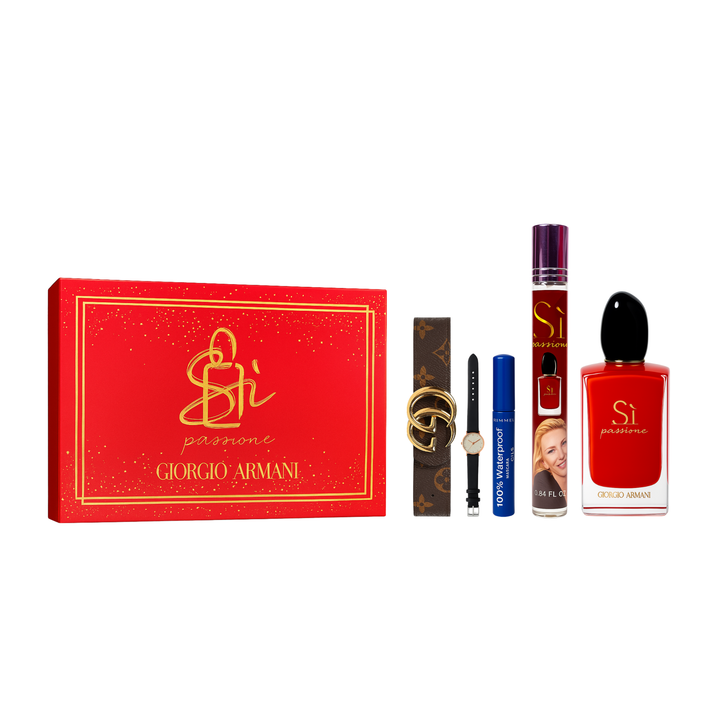 يضم: عطر بحجم كبير، تيستر بنفس الرائحة، ساعة أنيقة، حزام ناعم، ماسكارا، وشنطة هدايا أنيقة.